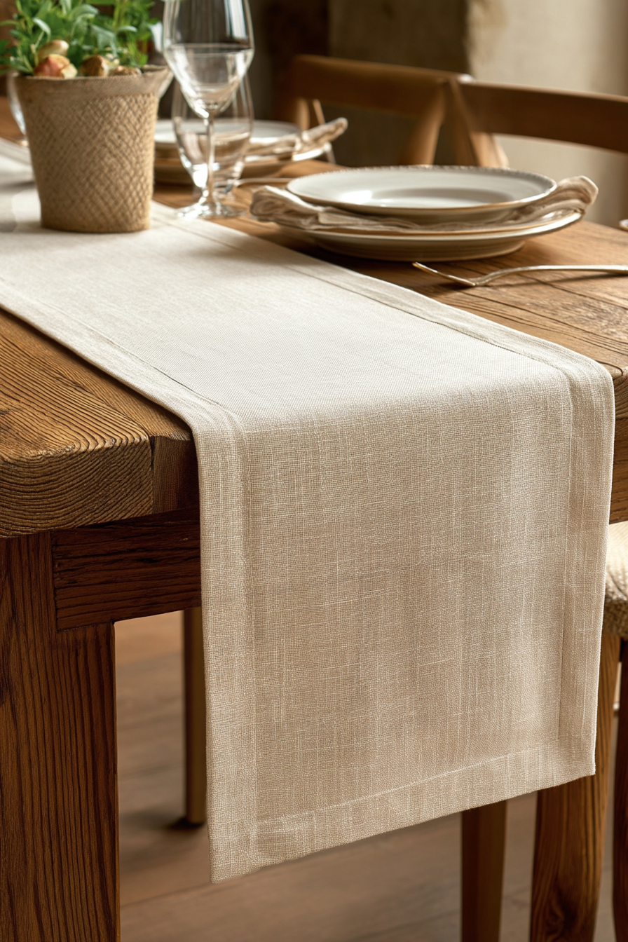 Elegancki bieżnik stołowy w kremowym kolorze, wykonany z wysokiej jakości lekko przeziernej plecionki poliestrowej imitującej naturalny len. Tkanina zachwyca subtelną strukturą i szlachetnym wyglądem, dzięki czemu doskonale wpisuje się w estetykę naturalnych, ponadczasowych aranżacji stołu.